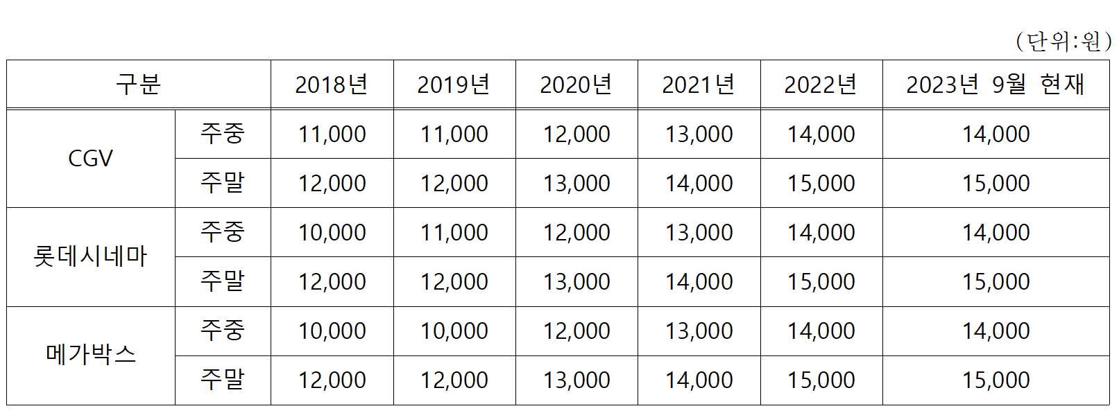 물가가 상승함에 따라 영화관람료 가격 또한 자연스럽게 인상되는 것은 충분히 예상되는 결과이나, 매년 가격이 큰 폭으로 오르는 것은 소비자에게 부담을 증가시키는 것이다.