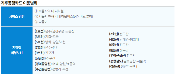 - 이용제외 : 신분당선, 서울지역 외 지하철, 광역/공항버스, 타 지역 면허버스